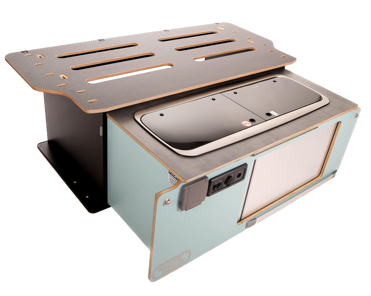 The camping kitchen hob unit also offers a large sink which is bigger than the the VW California Ocean's sink. With a stylish chrome tap and integrated fresh and waste water tanks allows for ease, convenience and practicality when doing the washing up. The Slidepod has an electric waste water valve to allow you to drain and dispose of your waste water easily and responsibly. The Slidepod Ultra comes with a 20L waste water tank and the Ultra Compact houses a 15L tank.