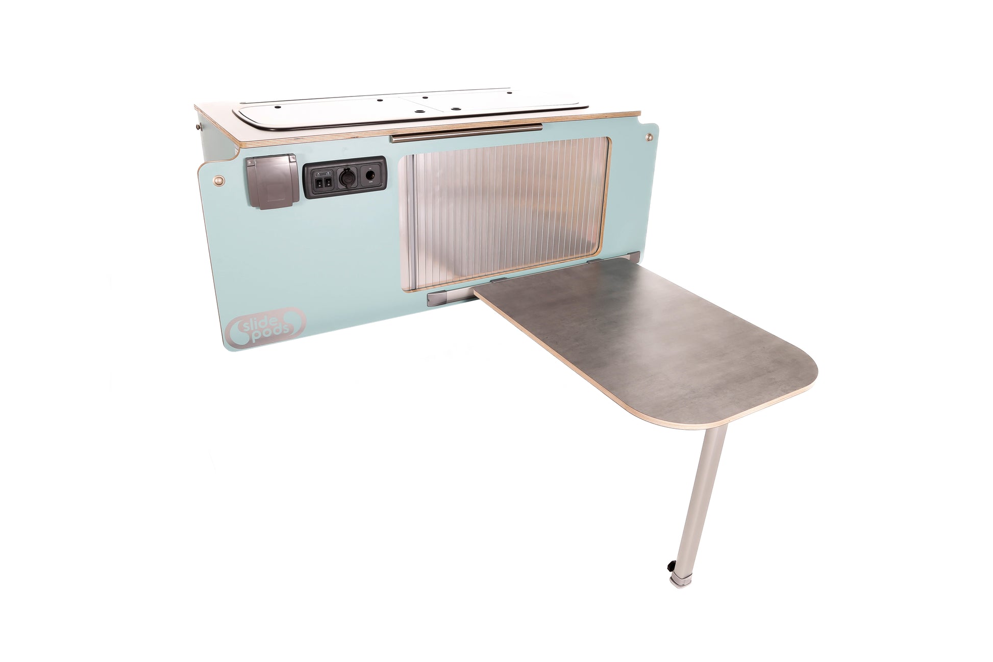 A handy removable table that stores nicely in a purpose made mattress (optional upgrade). The table clips onto the bar at the front of the Slidepod to provide a really useful table for food preparation, a place to eat, or just something to perch your cuppa. In addition, it can be a space to play games, or it can double as a desk if you’re working on the road. with USB sockets located on the pod for power.