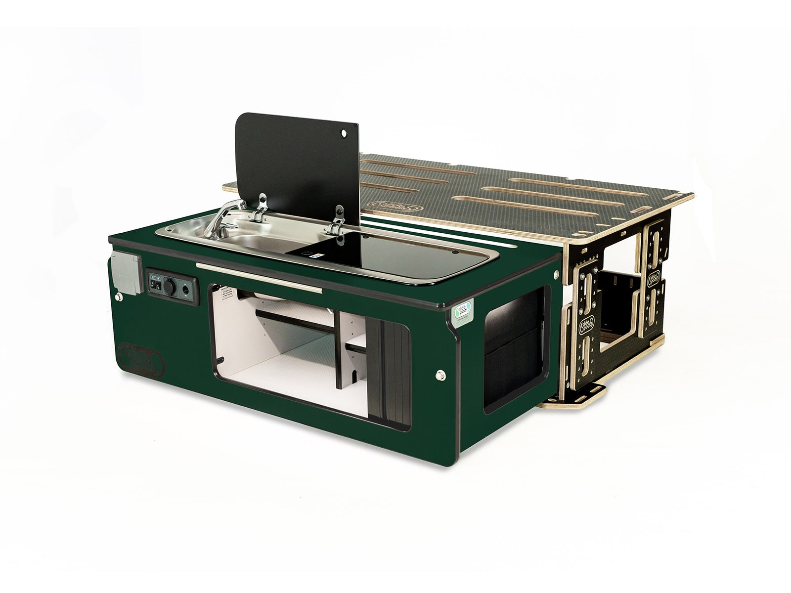 • Slide-out kitchen station — pulls out from the rear to provide a full cooking & washing setup, then stows securely for travel.