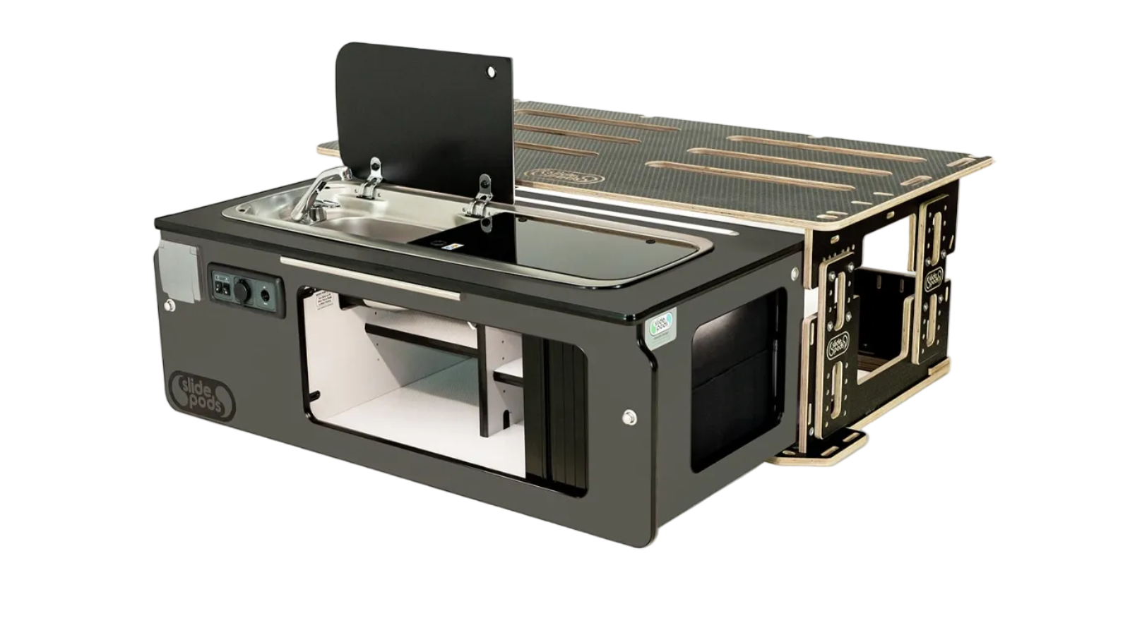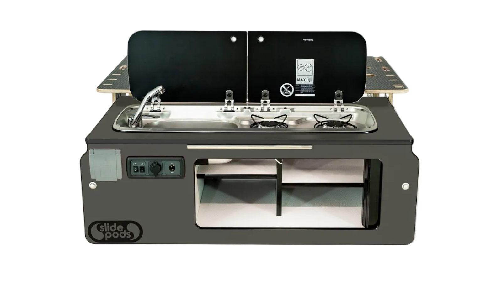 Double gas burner, large sink, up to 30L fresh water, 18L grey water with electric drain. Everything slides out for cooking and retracts when not needed.