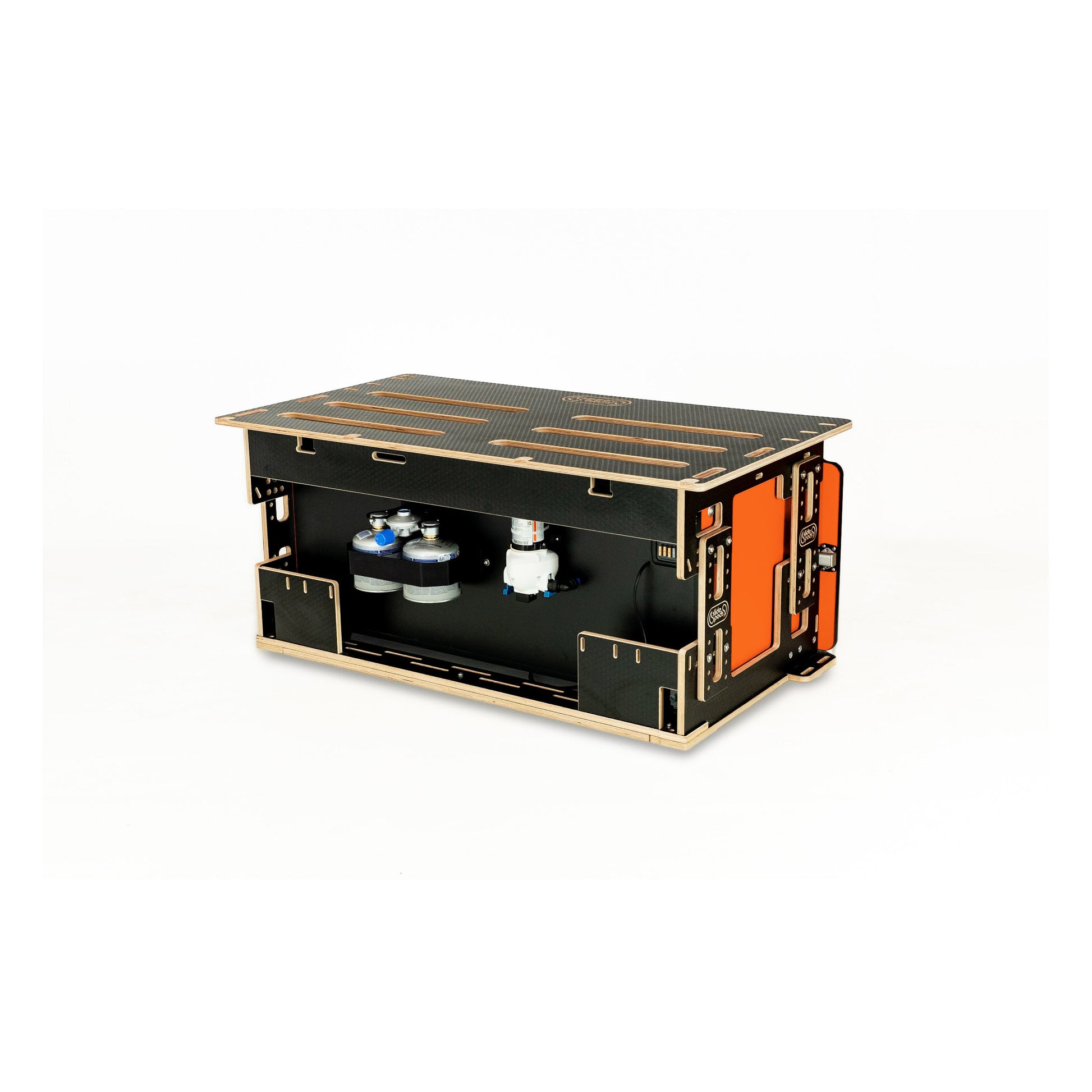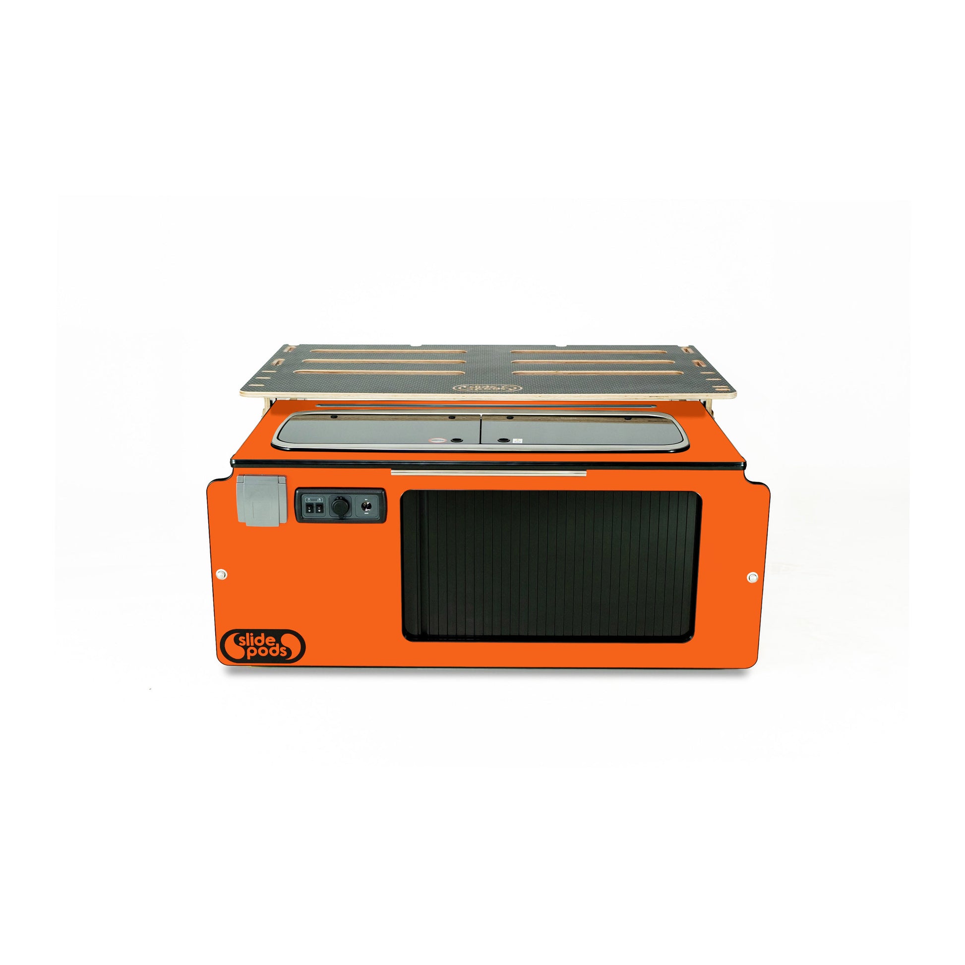 The Slidepod Ultra is a hand-built camper conversion system that provides a full kitchen, water supply, storage, and optional sleeping platform without permanently modifying your vehicle. The entire unit lifts out when the van needs to return to work or family use.